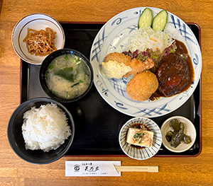 サクサクの衣で包まれたプリプリの大きいエビフライと、口に入れた瞬間トロっと広がる優しい甘さのカニクリームコロッケ。そして、肉厚があって食べ応え抜群のデミグラスソースがかかったハンバーグ。それにご飯、お味噌汁、漬物、小鉢2つ、サラダがついてきて、総合的に食欲を満たすボリューム満点の内容でした。