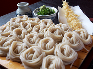 同店オススメの「ジャンボ天ざる」(1,280円)は2.5人前の蕎麦に長い海老天のセットで、蕎麦好きにはたまらないメニューです。蕎麦は信州の更科粉を主にブレンドした志乃崎オリジナルの蕎麦粉を使った自家製生麺で、毎朝打ち立ての蕎麦を提供されています。そばつゆも自家取りのお出汁と小豆島のお醤油で作ったかえしで作られており、より蕎麦の風味を堪能できます。